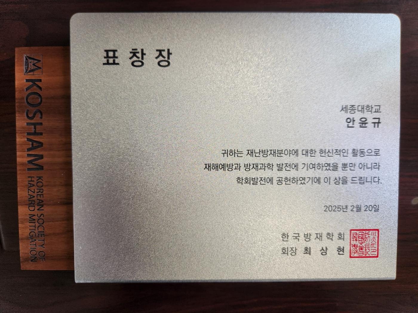 Recognized for Contributions: Award from the Korean Society of Hazard Mitigation
